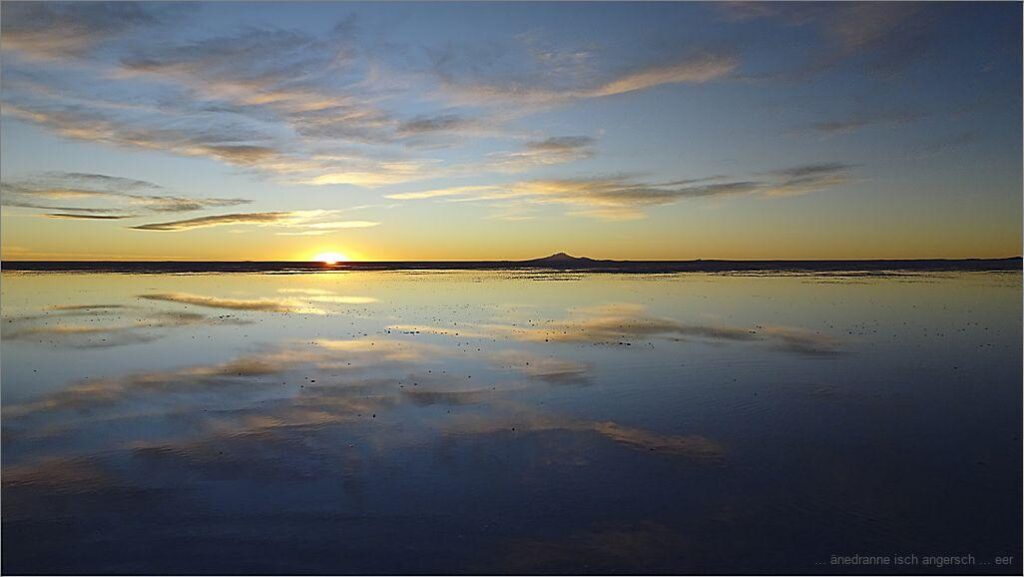 Der Abschluss vo dere Tour wird der Sunneungergang. Wieder fasch in Uyuni, fahrt der Guide (u mit ihm vieli angeri) mit üs i ne Berich, wo überfluetet isch. Dert warte all die Gruppe Tourischte mit meh oder weniger Getöse und Show der Sunneungergang ab.