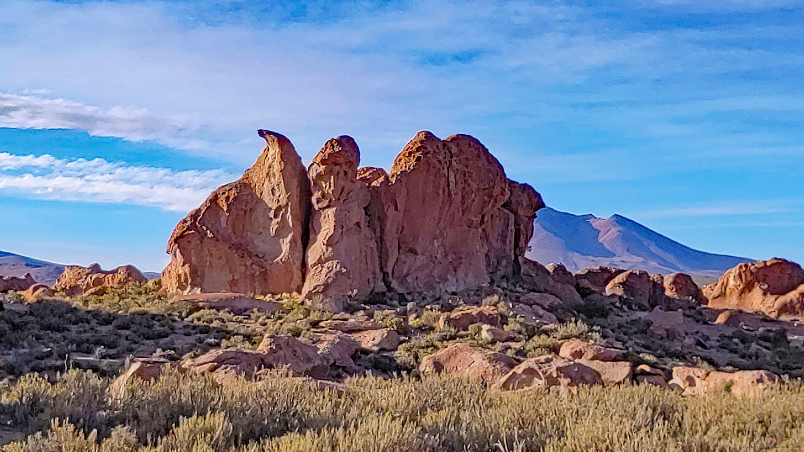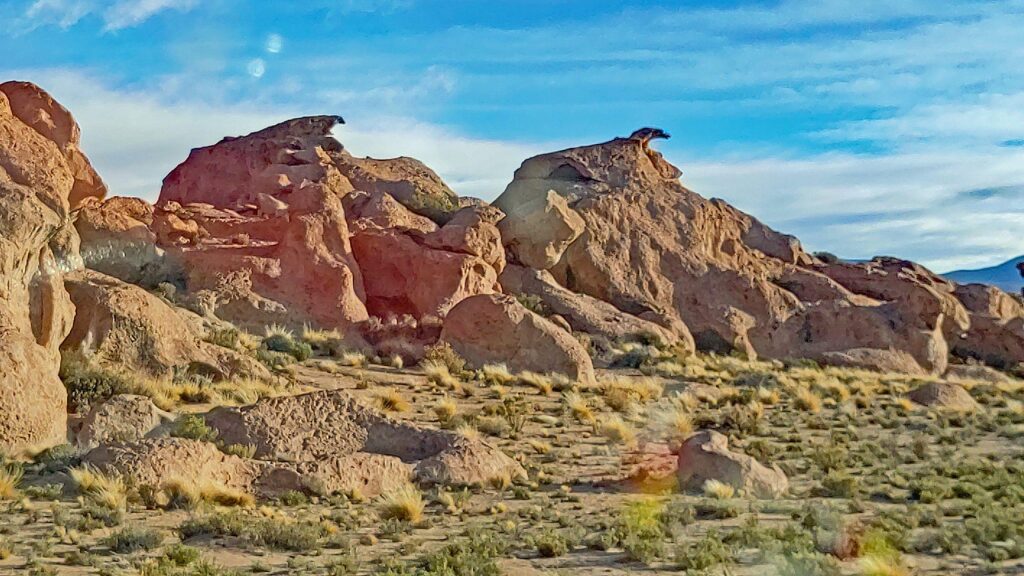 D Umgäbig isch hügeliger worde. Alota, e grössere Ort umfahre mer. Uf der Strass, wo guet usb’boue isch, fahre mer dür ds «Valle de las rocas». E total frömdi, idrücklech angeri Wält hie, schön, wild, faszinierend u frömd.