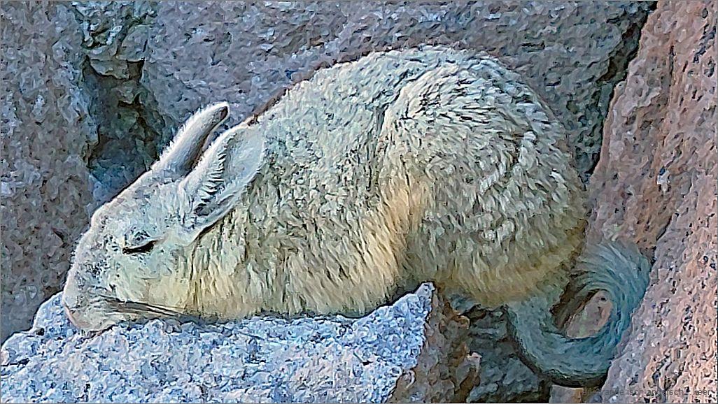 Chlyneri Tier g’seht me sälte hie in Bolivie. Während em Irume g’seh n ig es öppe chüngugrosses Tier, zwe Felse wyter. Die Einheimischen säge Viscatcha derzue. Viscatchas si mit Chinchillas verwandt. I opfere üser letschte zwöi Rüebli, (ohni z wüsse, öb si die ässe), lege se uf e Felse u säge tschou. Nach u nach hei mer alles wieder a sim Platz. I der Zwüschezyt isch fasch elfi.