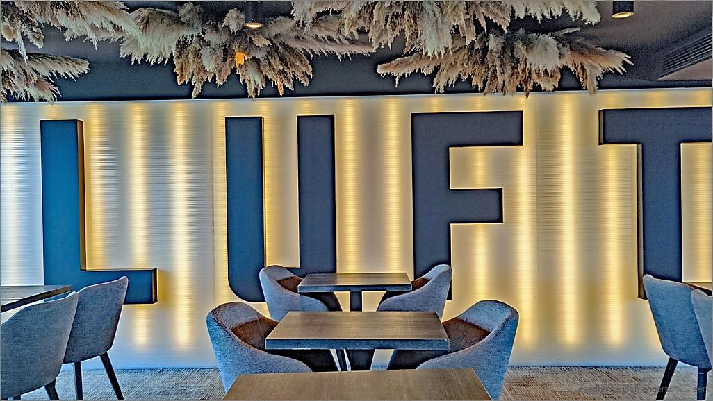 Irgendeinisch bräche mer uf u loufe zum Hotäl zrügg. Dert wei mer no i d ‚LUFT‘. Das isch es Lokal, wo im Hus näbedranne zwölf Stockwärch über em Bode isch. Bi me Spezialkafi g’niesse mer die Ussicht. Uf die drü müesse mer im Hotäl gah ds Gepäck reiche u zum Bahnhof marschiere.