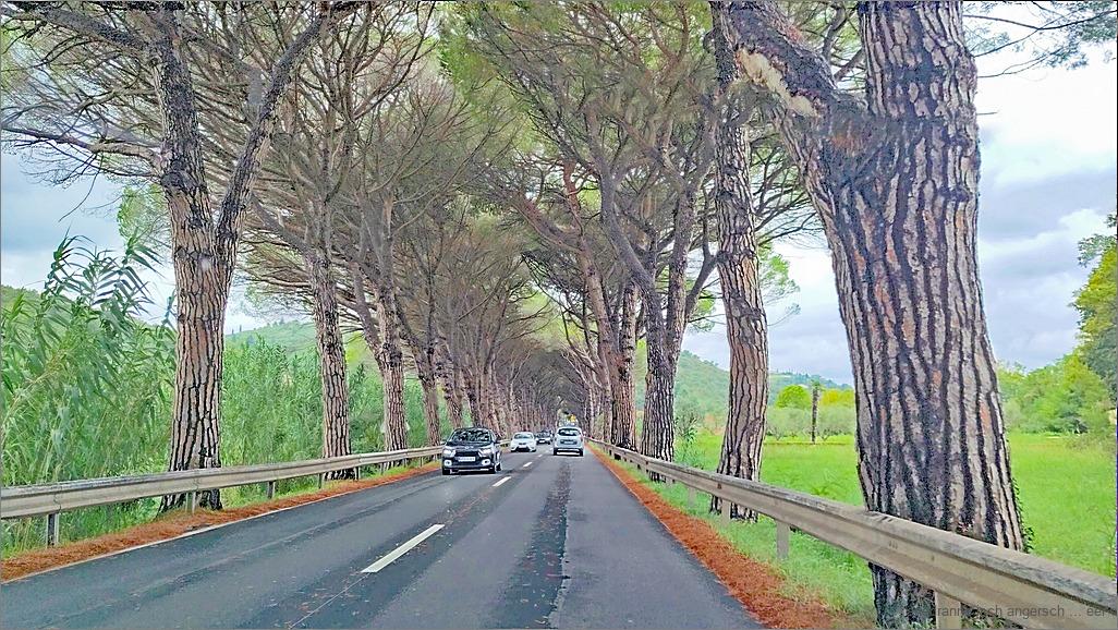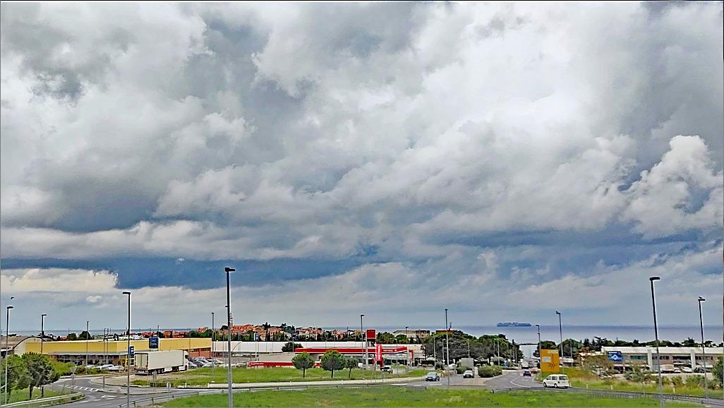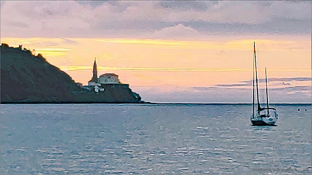 So, u itz geit es em Meer etgäge. Je nächer mer däm chöme, deschto meh lockeret sech d Bewölkig. In Strunjan si mer no vor de drü un es tröpfelet nume no.