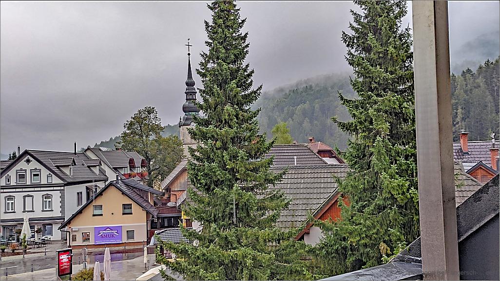 Es rägnet, (für nid z schribe, es sch*) bim Ufstah in Kranjsk Gora. Scho die ganzi Nacht het me’s g’höre tropfe. Gäge üsi Abfahrt hi drähit es no uf.