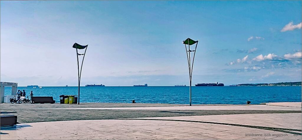 Uf em Meer usse warte d Frachtschiff. Öb si nach Slowenie chöme, oder nach Italie wei isch nid so eifach z säge. Wenigschtens hei si u o mir wunderbar’s Wätter.