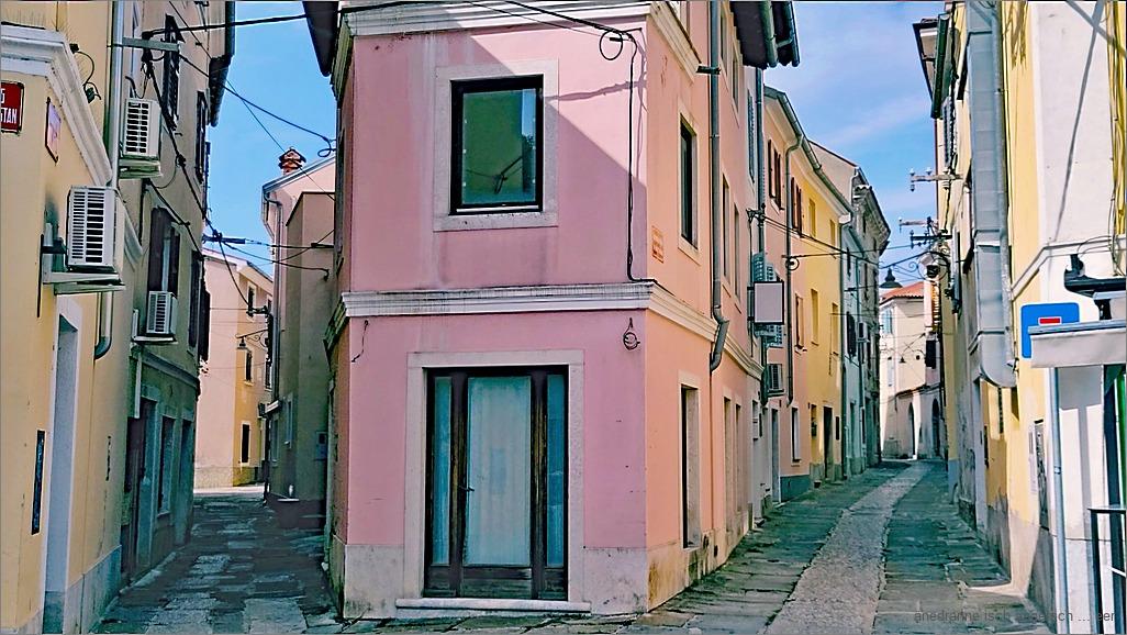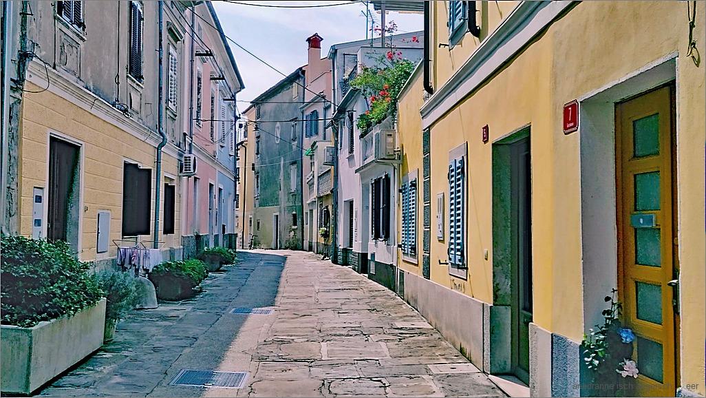 Em Strand, sprich der Hafestrass nah isch de o ganz Izola u derzue no alli B’suecher ufg’reihelet u brate a der Sunne. – O da isch nid alles schön. Irgendeinisch chehre mer um u sueche n is de e eigete Wäg. Alti, grossi Hüser umrahme der Hafe; – si hüt Hotäl, früecher ehnder Paläscht, Handelshüser oder Lager. Vom Hafe si mer gly i der Altstadt, dür d Gasse löh mer is lah trybe.