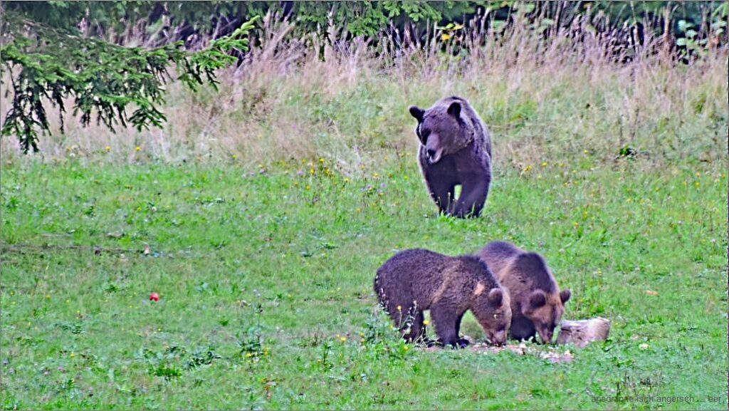 I re chlyne Gruppe höckle mer i me Beobachtigshüsli u g’seh uf ne Waldliechtig. Scho wo mer a chöme isch e Bär da. Später chunnt e Bäremuetter mit zwöi Junge. Es het aber o angeri Tier da.