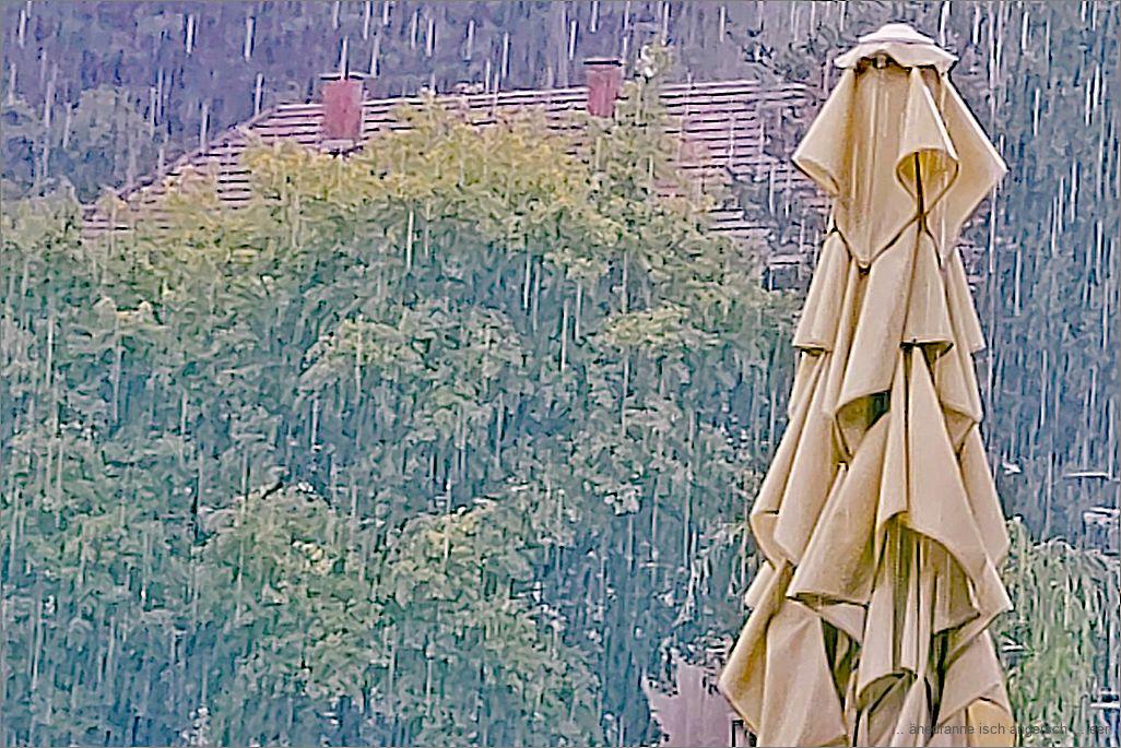 Gross use wei mer nümm, es rägnet geng no, drum ässe mer am siebni i der Lobby no Znacht.