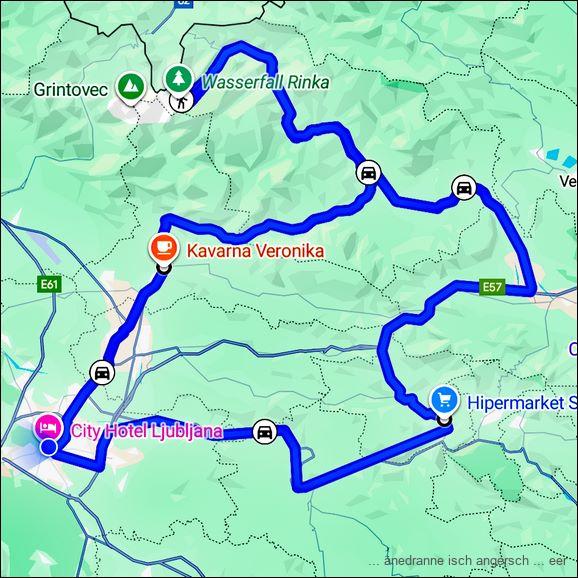 Nach re Stung si mer wieder uf em Rückwäg. Itz hock i vorne im Outo. Es rägnet ir Zwüschezyt wie us Chüble. D Mateja fahrt e öppis angere Wäg. Nach re Kafipouse i me SPAR geit es Ljubljana zue. Viertel vor sächsi chöme mer a, verabschiede n is u göh a ds Trochene.