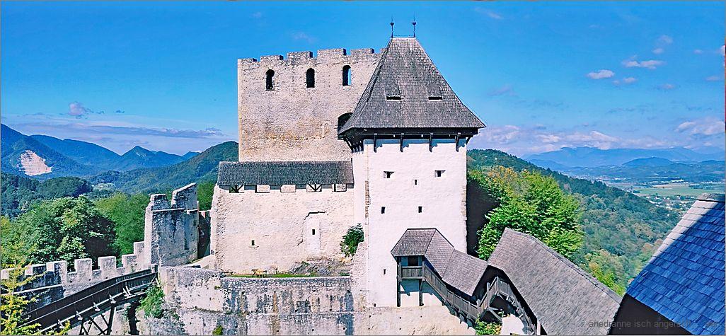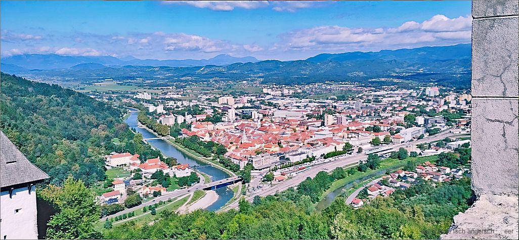 Mer göh hüt gah d Burg Celje b’sueche. Höch über allem ( o über mim Hotälzimmer) luegt d Burg us em Wald use. Mer hei n is vorg’noh, mit em Bus ueche z fahre. Bi der Reception erkundige mer is u stabe de los. Drum lande mer o bi der Überland-Busstation u nid bim Celjebus. Churz entschlosse kapere mer es Taxi u das bringt is de im Hui für weni Gäld uf e Burghügu ueche. Es isch e spannendi Sach, der Burgg’schicht u dere vo de Bewohner chley nachezgah. D Grafe vo Cilli si witume bekannt g’sy, es het aber o berüchtegti us dere Familie g’gäh. Vo der Burg ache si mer z Fuess ungerwägs.