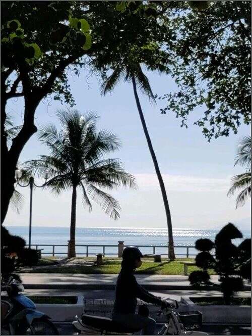 Dusse isch de scho ei Betrieb. Vom Hotälreschturant g’seht me i d Nha Trang Bucht. E grandiose Usblick. Allerdings isch zwüschem Wasser u mir e Strass, wo nid g’rad weni Verchehr het.