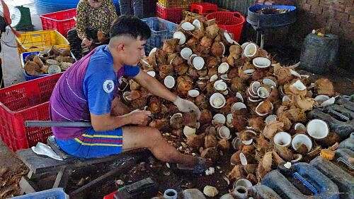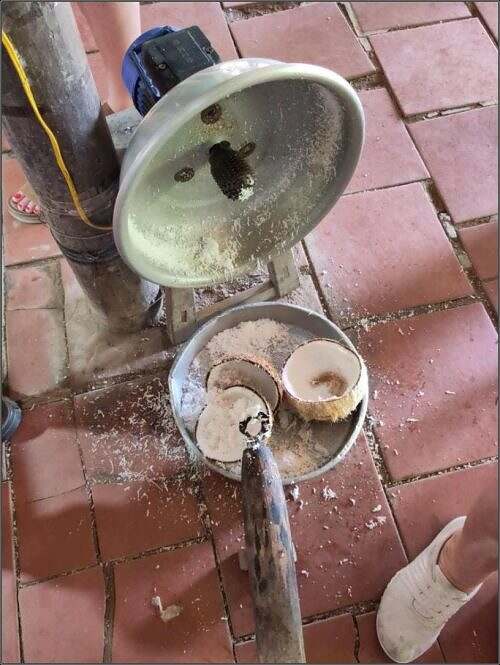 Die Familie verarbeitet o Kokosnüss. Si bohre ds Fleisch us der Schale. Die Raschpel wärde de verchochet zu karamelähnleche Täfeli.