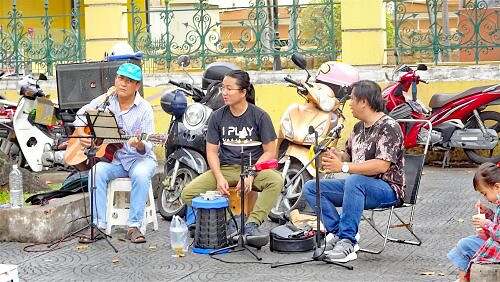 Dusse, uf em Trottoir, spile Vietnamese alti Popsongs vo de Beatles u vo de Rolling Stones…