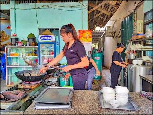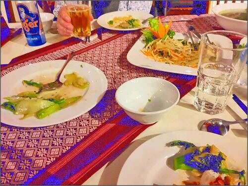 Zmittag ässe mer i me typisch vietnamesische Reschturant. Der ‚B’sitzer‘ redt nid änglisch. Zum Glück hei mer der Frömdefüehrer bi n is, wo b’stellt. Eis Menü, me nimmt was me wott dervo. Es isch super.